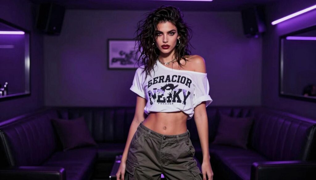 She moves through the low-lit room with a silence that’s louder than the ambient jazz. Her energy precedes her, a magnetic pull that tugs at the edges of every hushed conversation, every subtle glance. She is not just in the room; she is the room’s new center of gravity. There is a story in the way her baggy denim pools around her sneakers, a poem in the deliberate, lazy drape of the oversized leather jacket hanging off one shoulder. She is the physical embodiment of that classic cool, that timeless confidence everyone’s been missing, but remixed with an unapologetic, modern grit that feels both dangerous and divine.