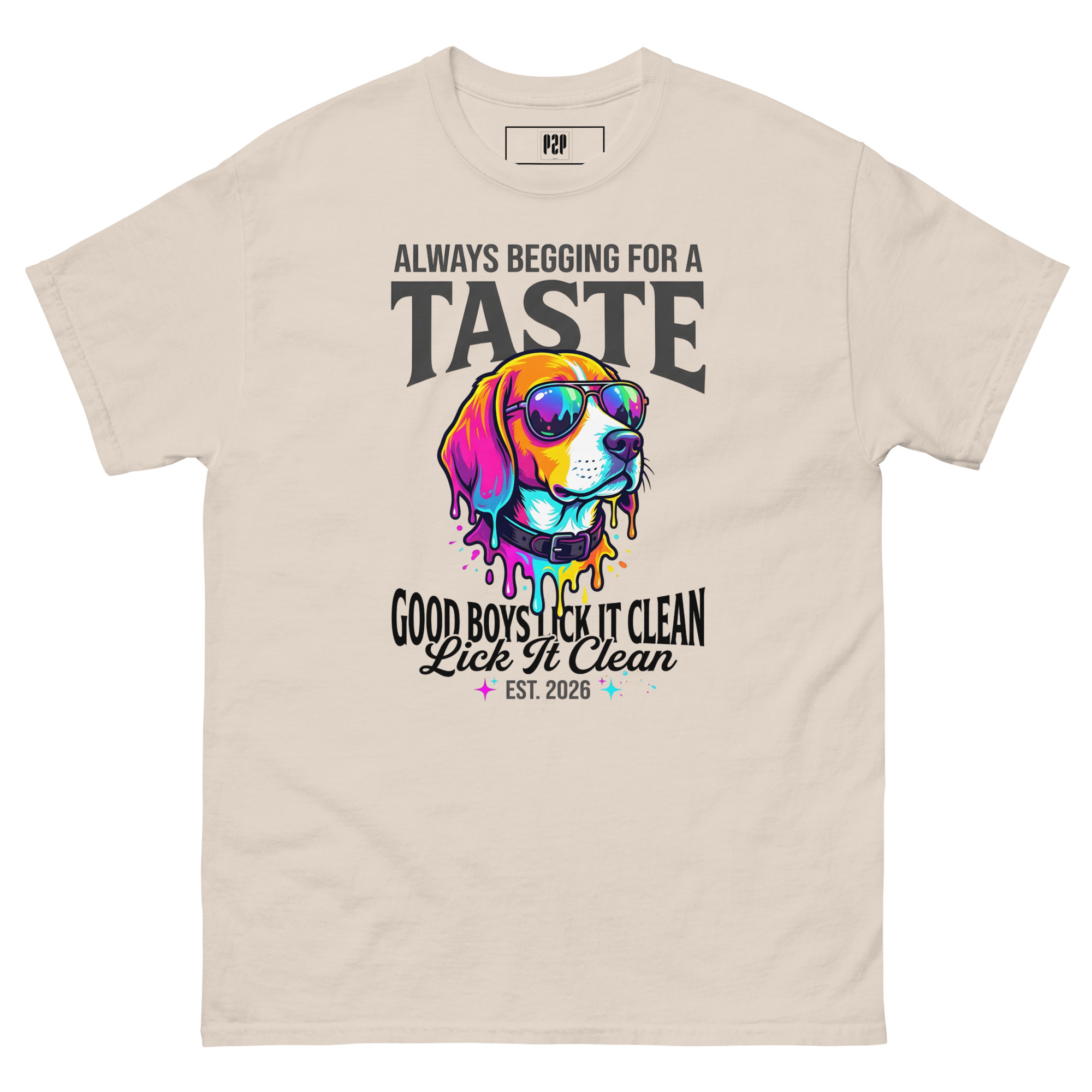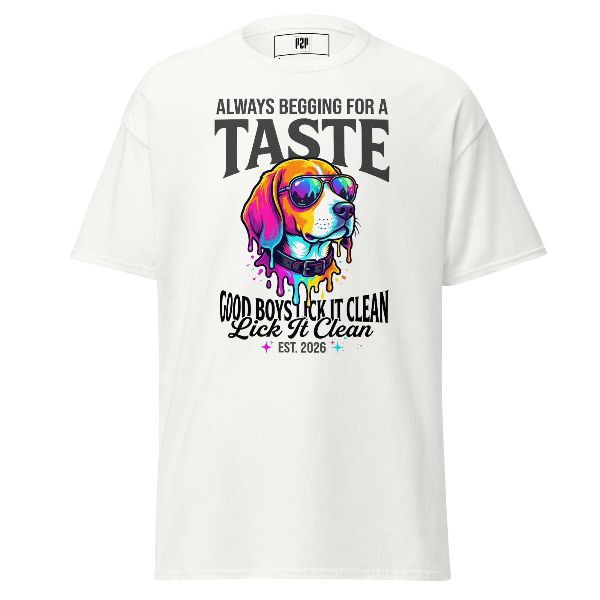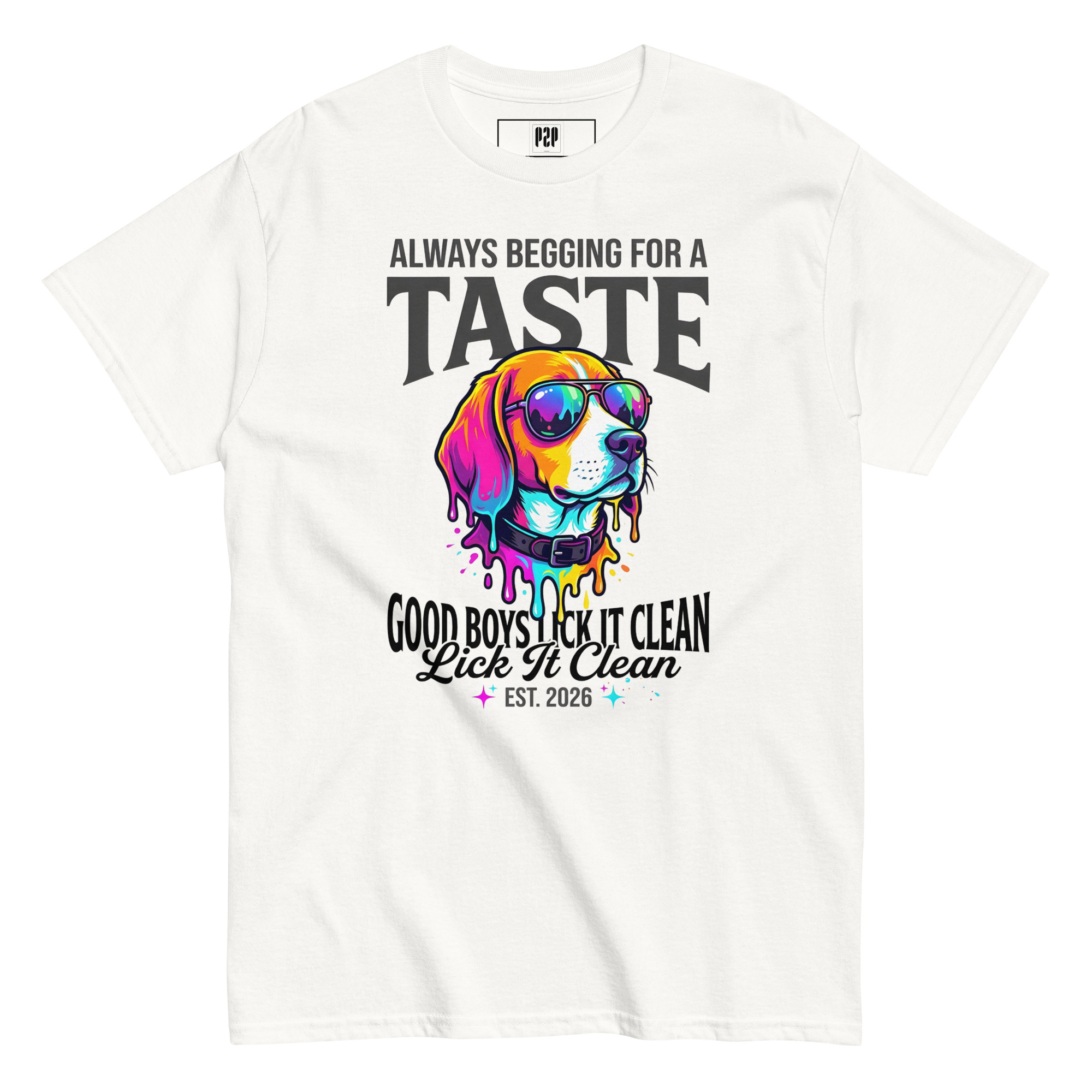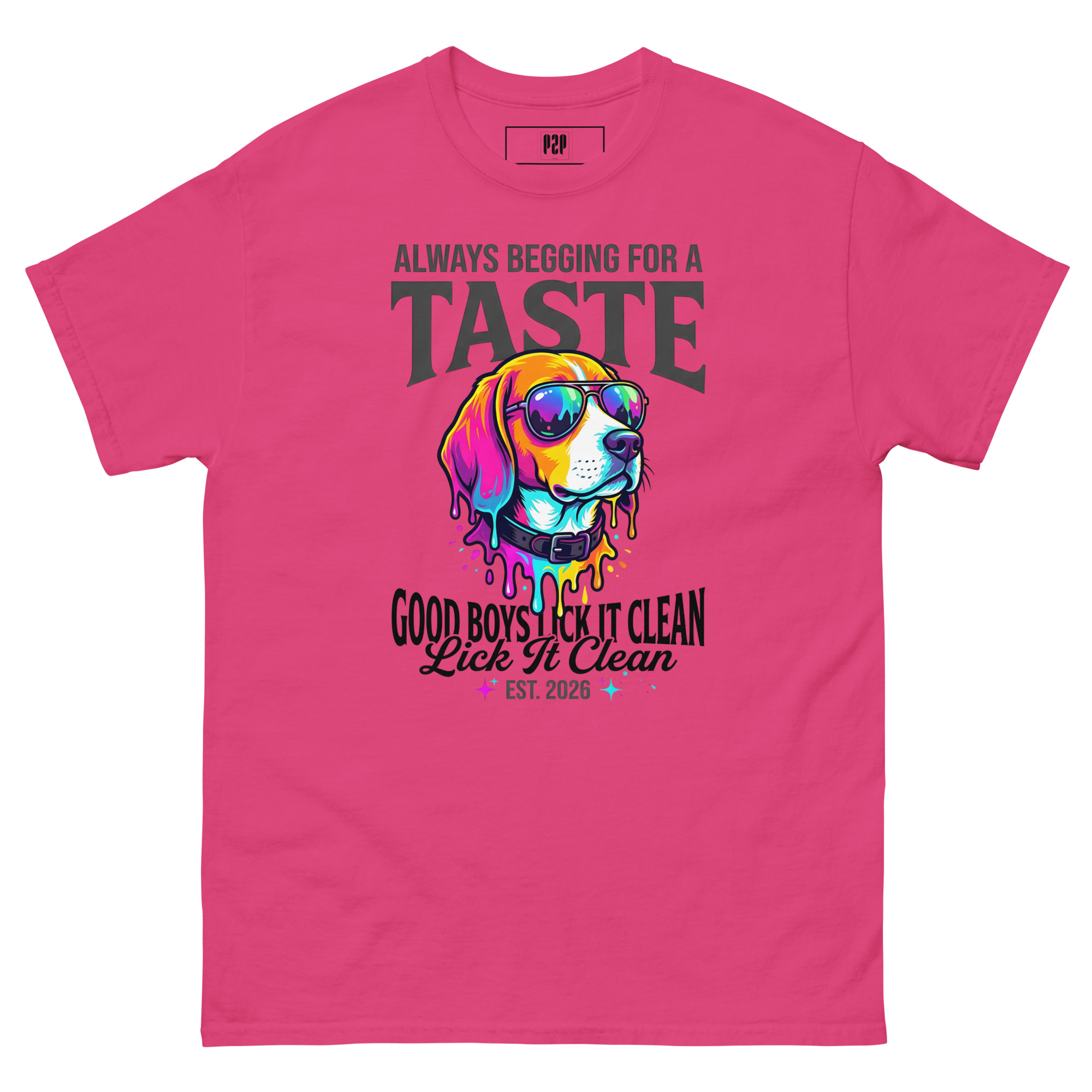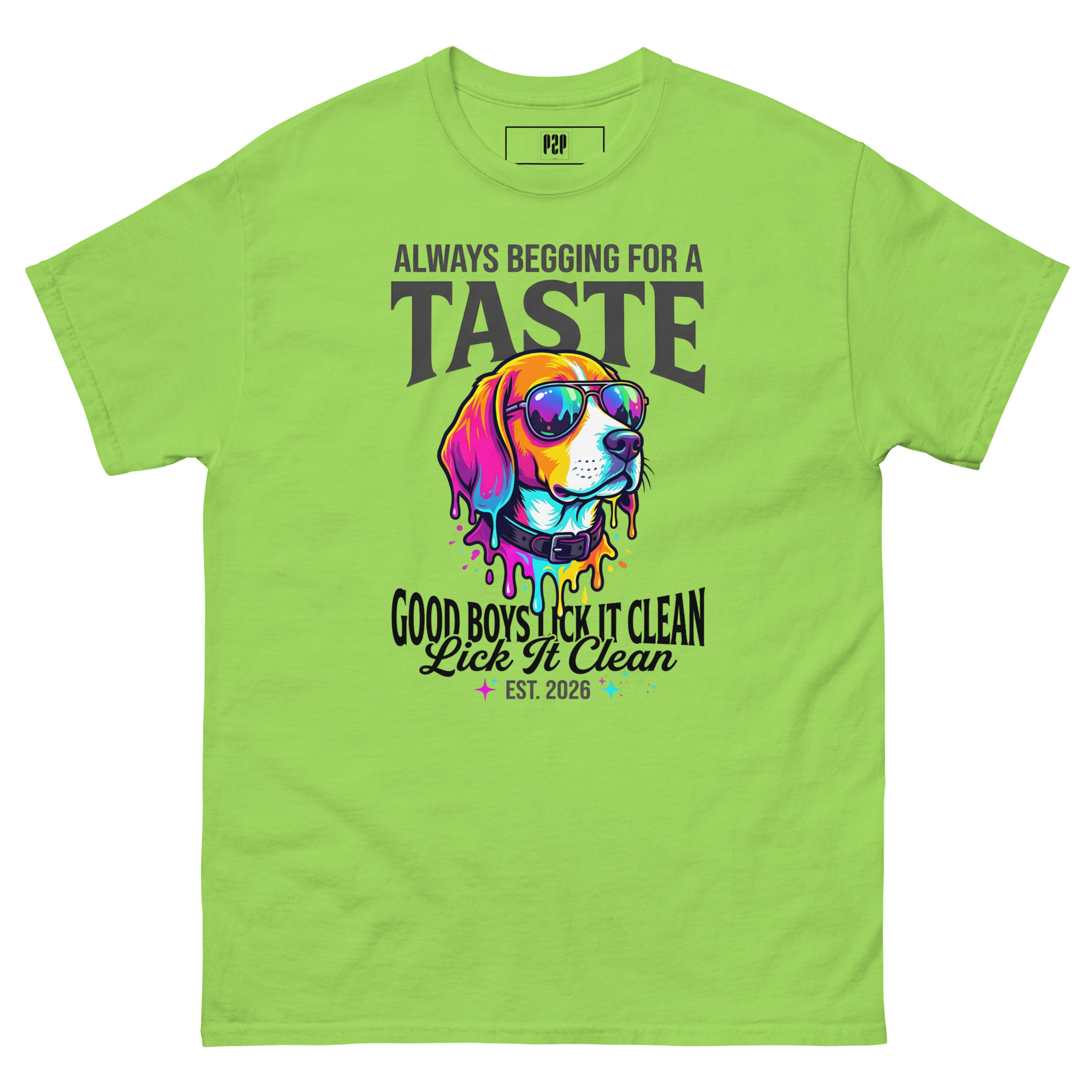 Embrace your unapologetic Y2K aesthetic with a shirt that does all the talking for you. 🗣️ Featuring a vibrant, neon-melting hound rocking aviator shades, this design literally drips with main character energy. ✨ Emblazoned with “Always Begging For A Taste” and “Good Boys Lick It Clean,” it’s the ultimate double-entendre masterpiece for those who know exactly what they want—and how they like it delivered. 💅