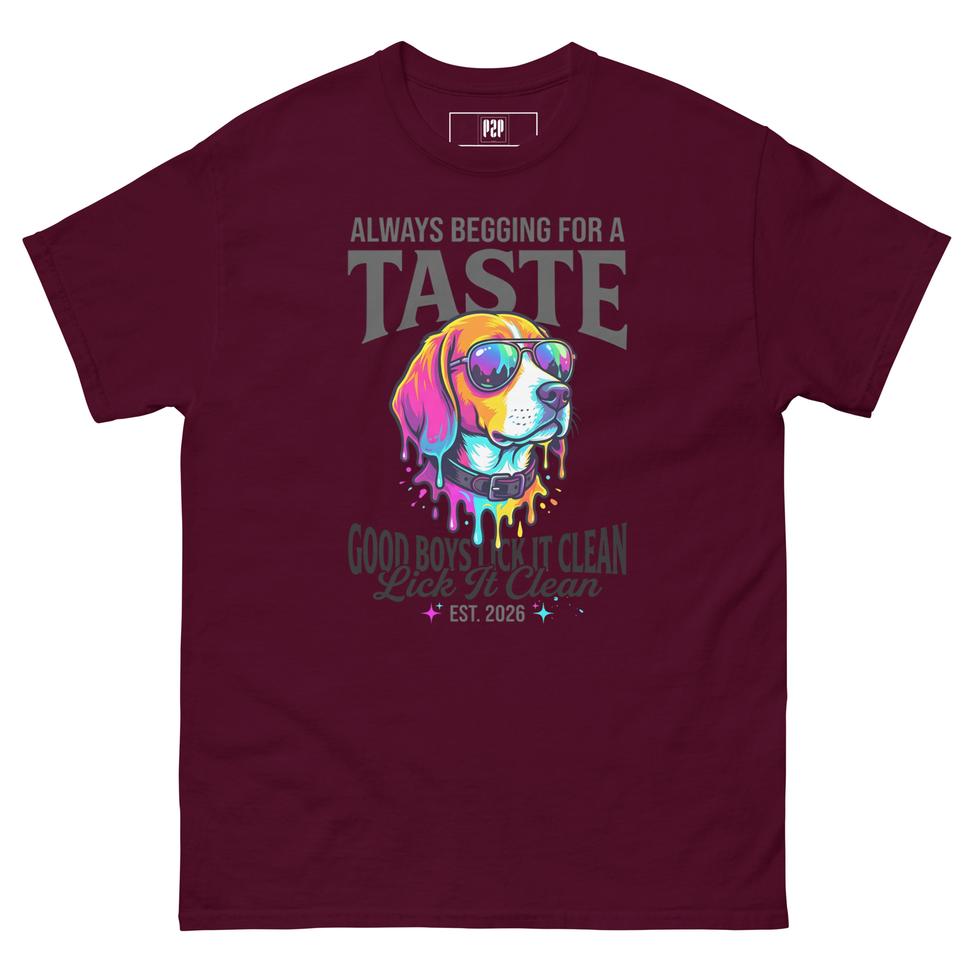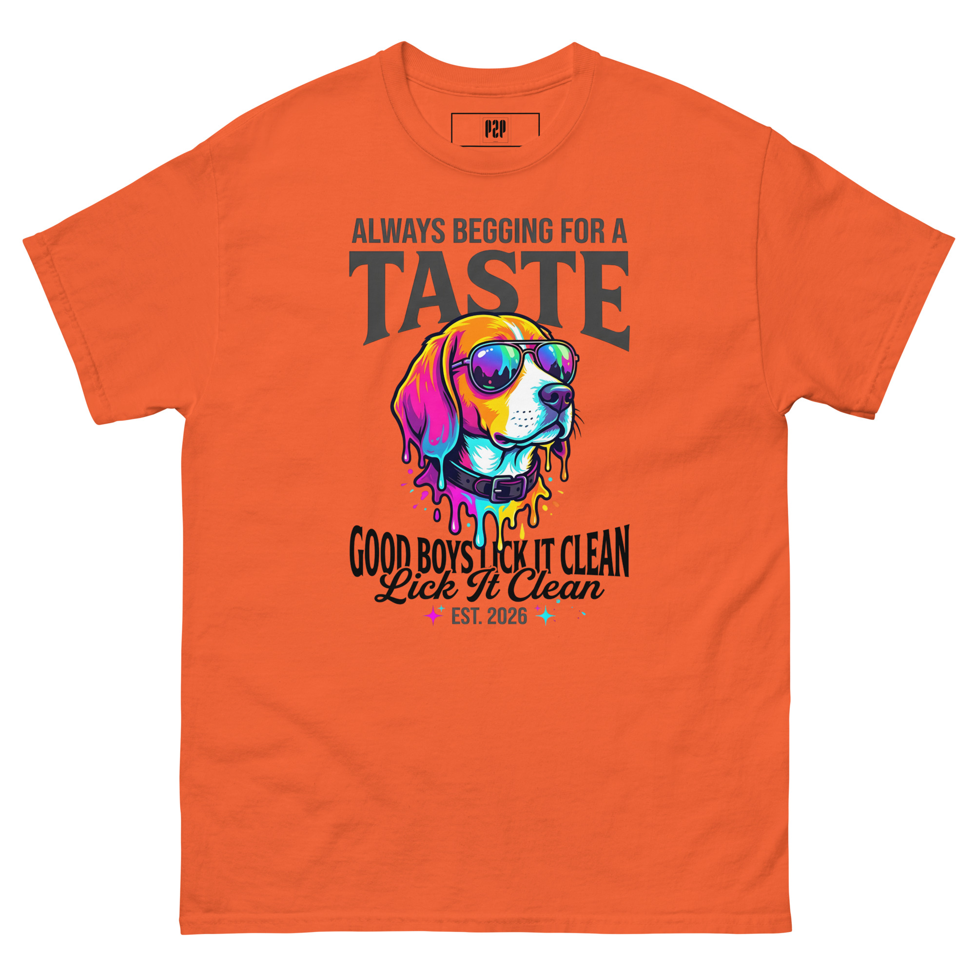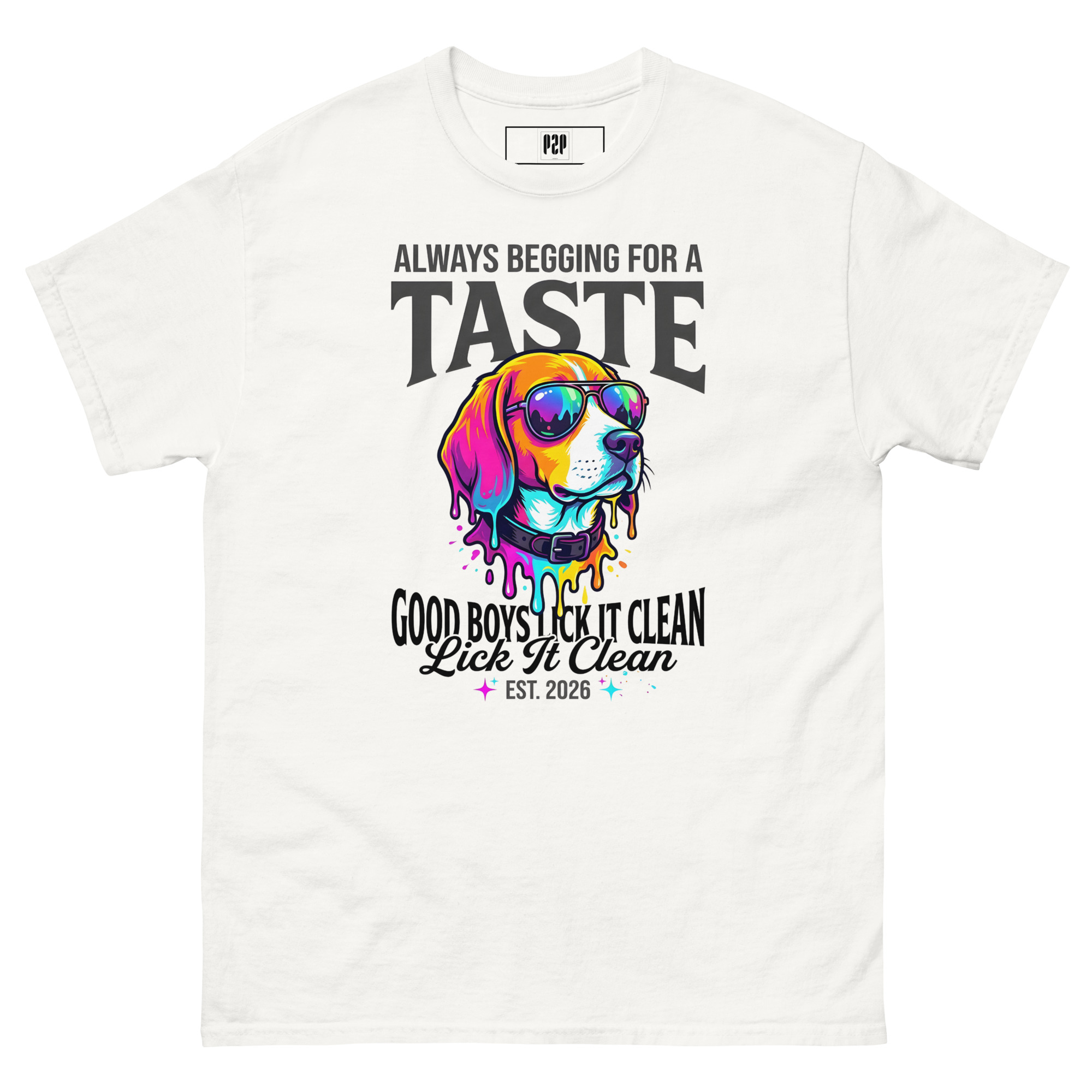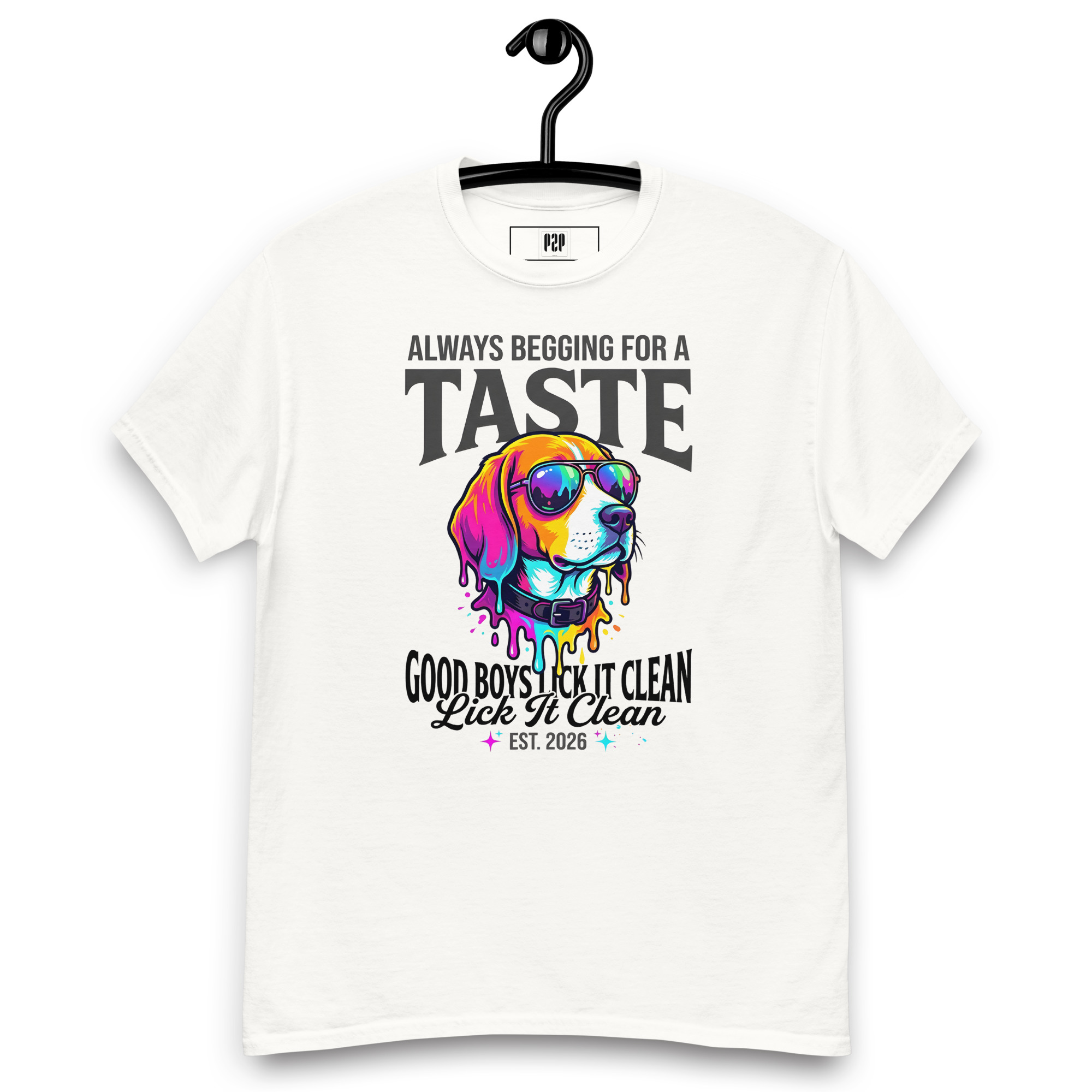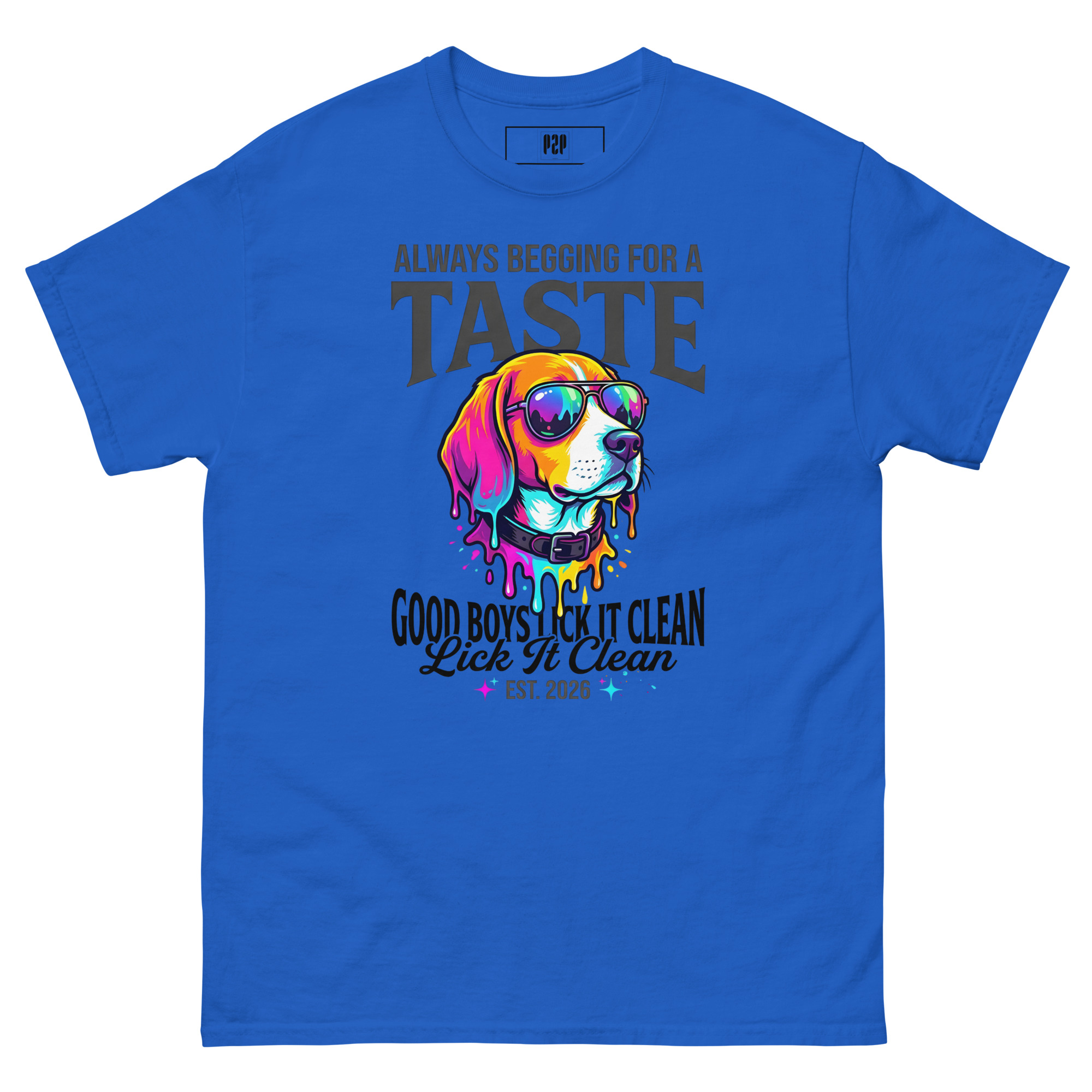 Embrace your unapologetic Y2K aesthetic with a shirt that does all the talking for you. 🗣️ Featuring a vibrant, neon-melting hound rocking aviator shades, this design literally drips with main character energy. ✨ Emblazoned with “Always Begging For A Taste” and “Good Boys Lick It Clean,” it’s the ultimate double-entendre masterpiece for those who know exactly what they want—and how they like it delivered. 💅