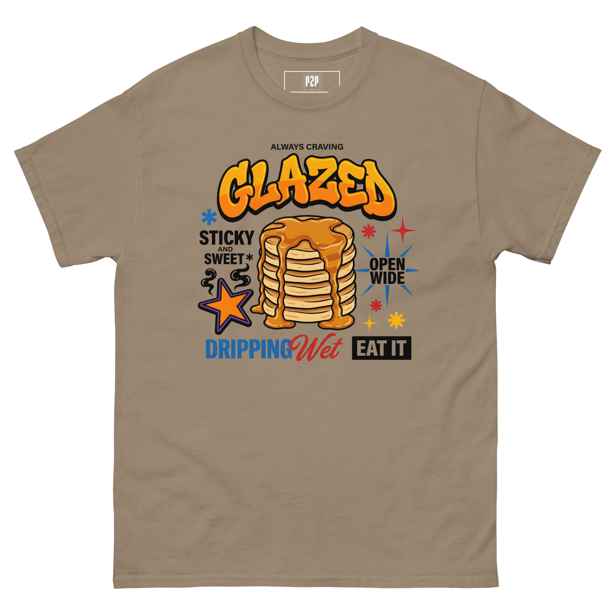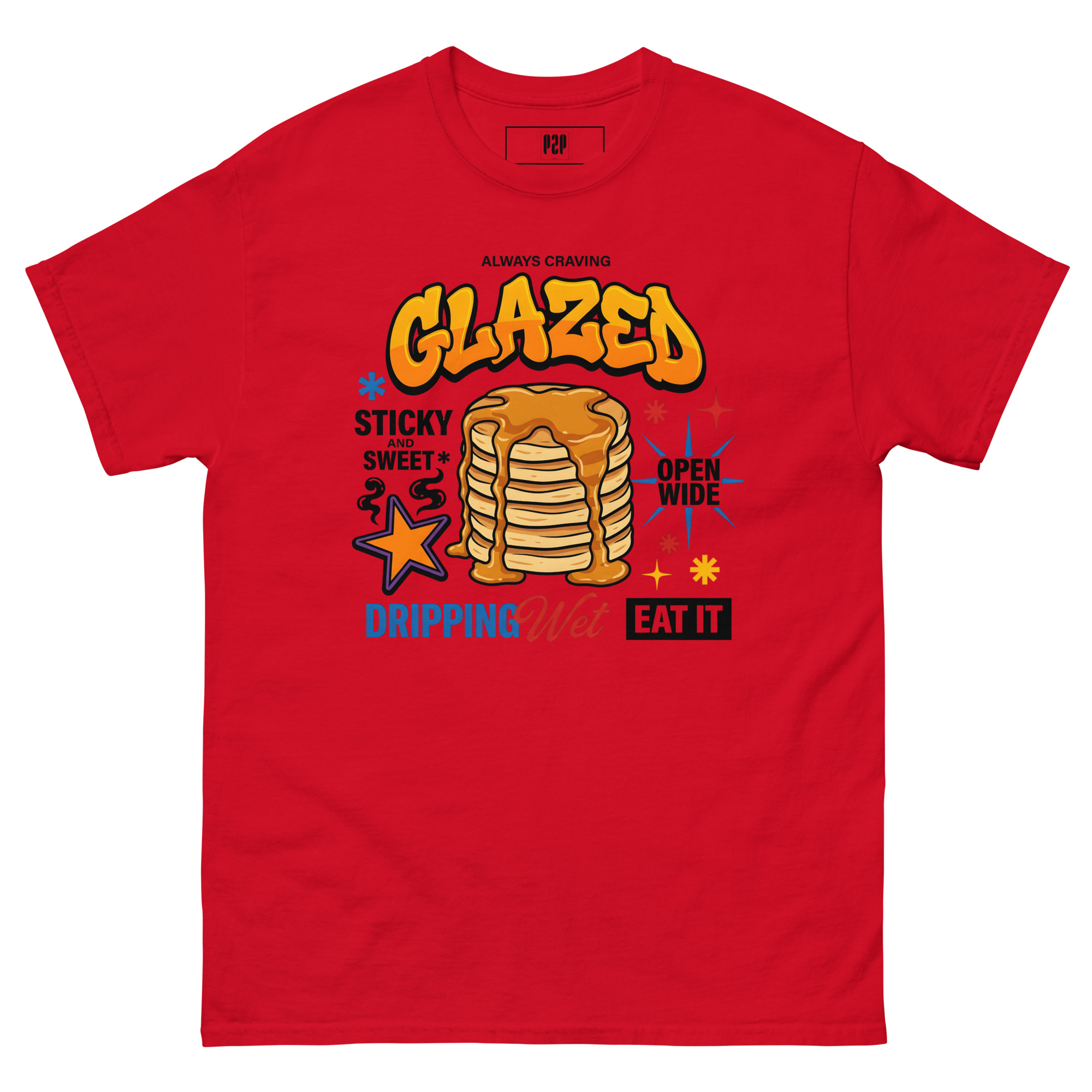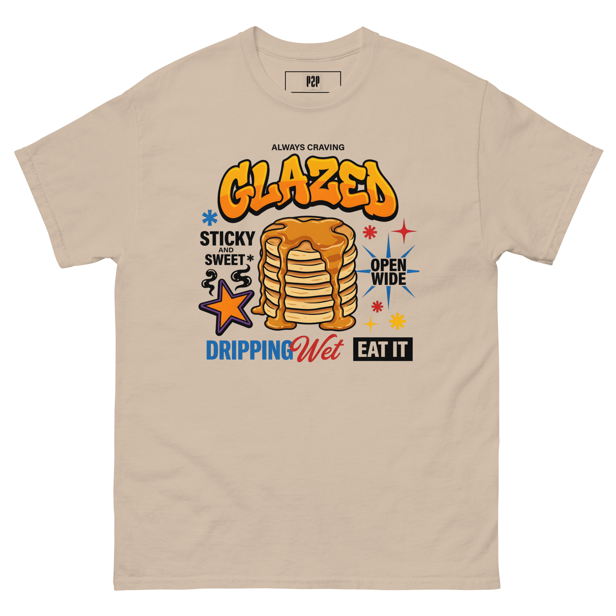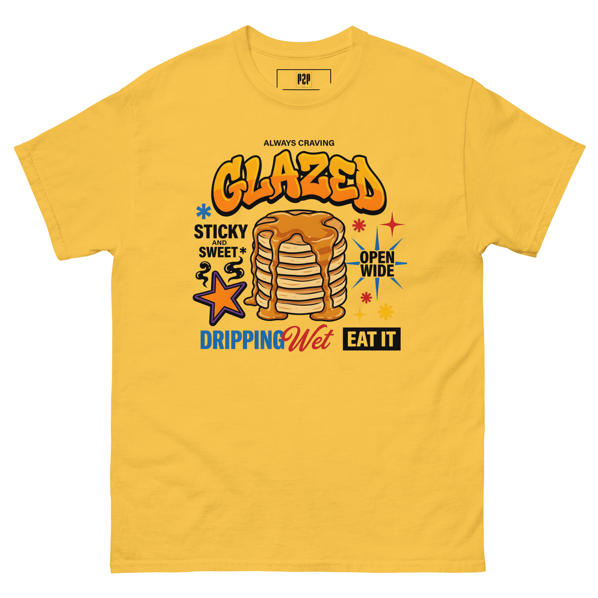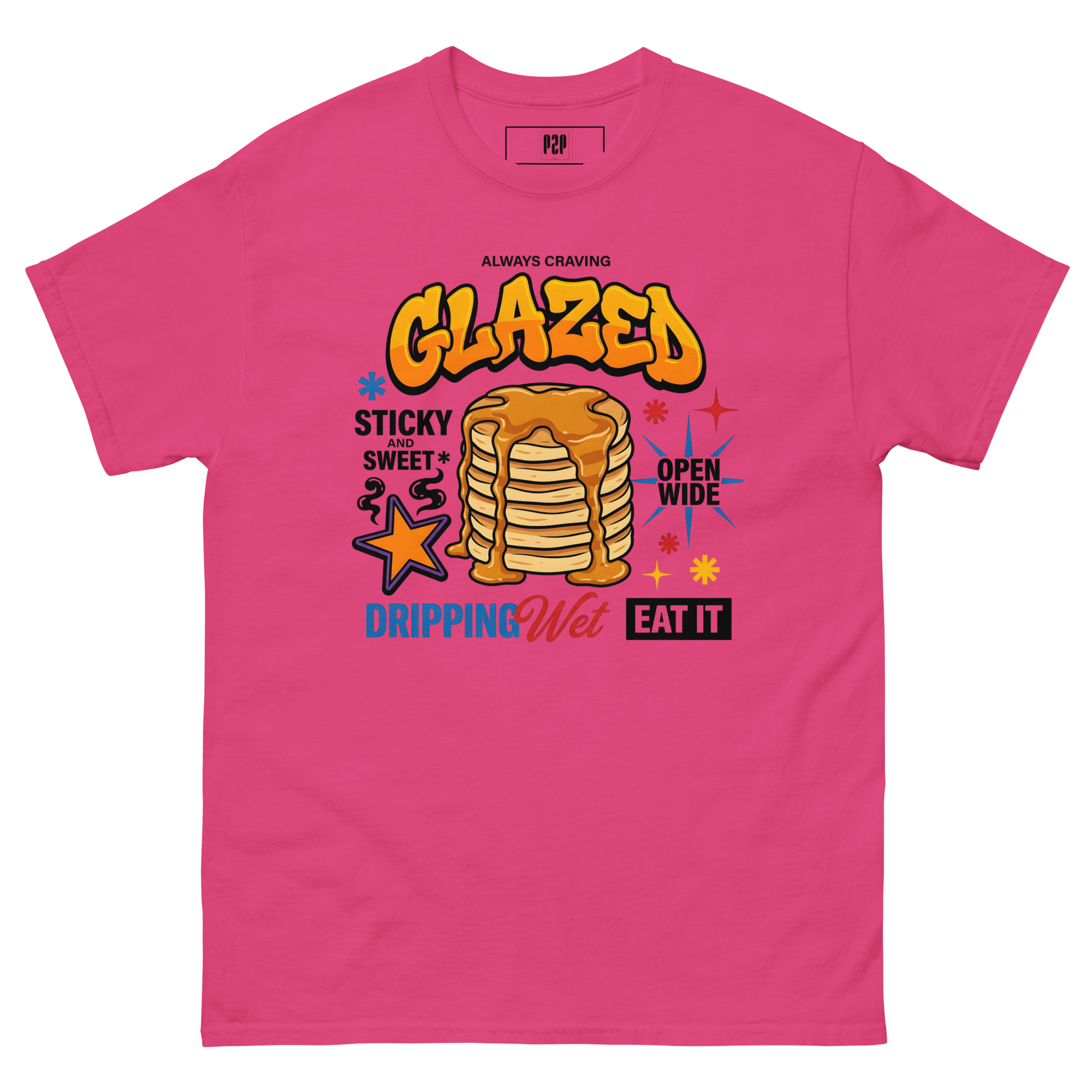 “LET’S BE HONEST, YOU ALWAYS CRAVE IT GLAZED. SERVE IT UP HOT, STICKY, AND SWEET WITH A TEE THAT PROMISES TO LEAVE THEM DROOLING. THIS SPICY LITTLE NUMBER TAKES ‘OPEN WIDE’ TO A WHOLE NEW LEVEL, DELIVERING THE PERFECT AMOUNT OF DOUBLE ENTENDRE CHEEKINESS WITHOUT GETTING YOU KICKED OUT OF BRUNCH. WE KNOW YOU LIKE IT DRIPPING WET, SO WE DRENCHED THIS DESIGN IN PURE, UNADULTERATED SAUCE. 🥞💦