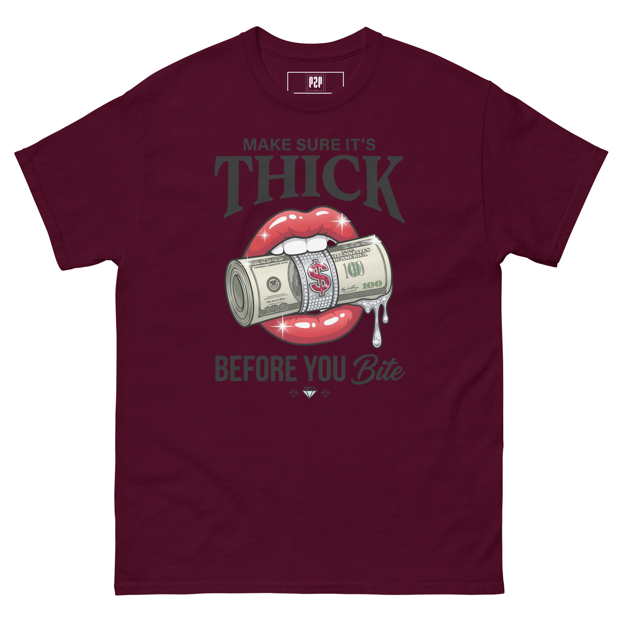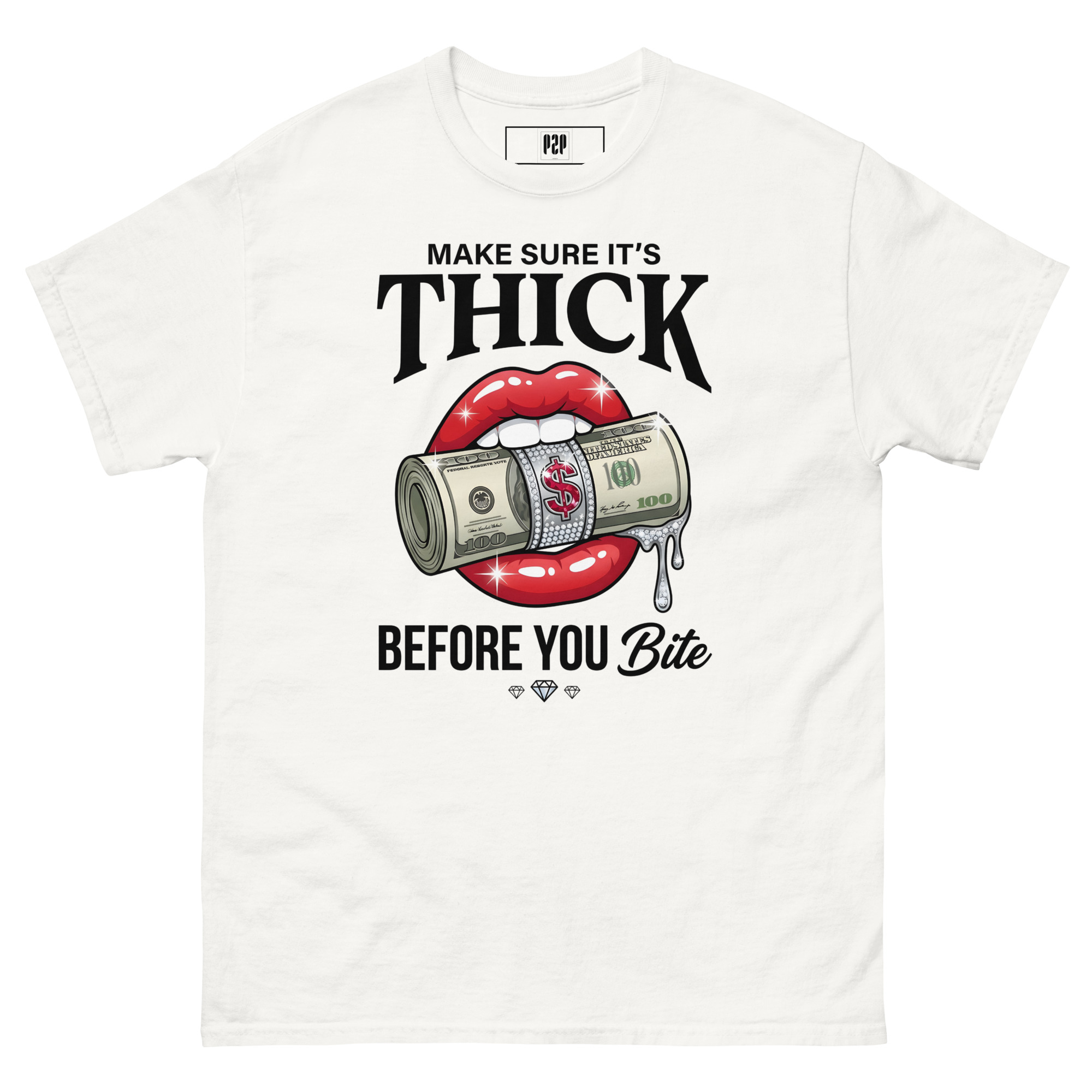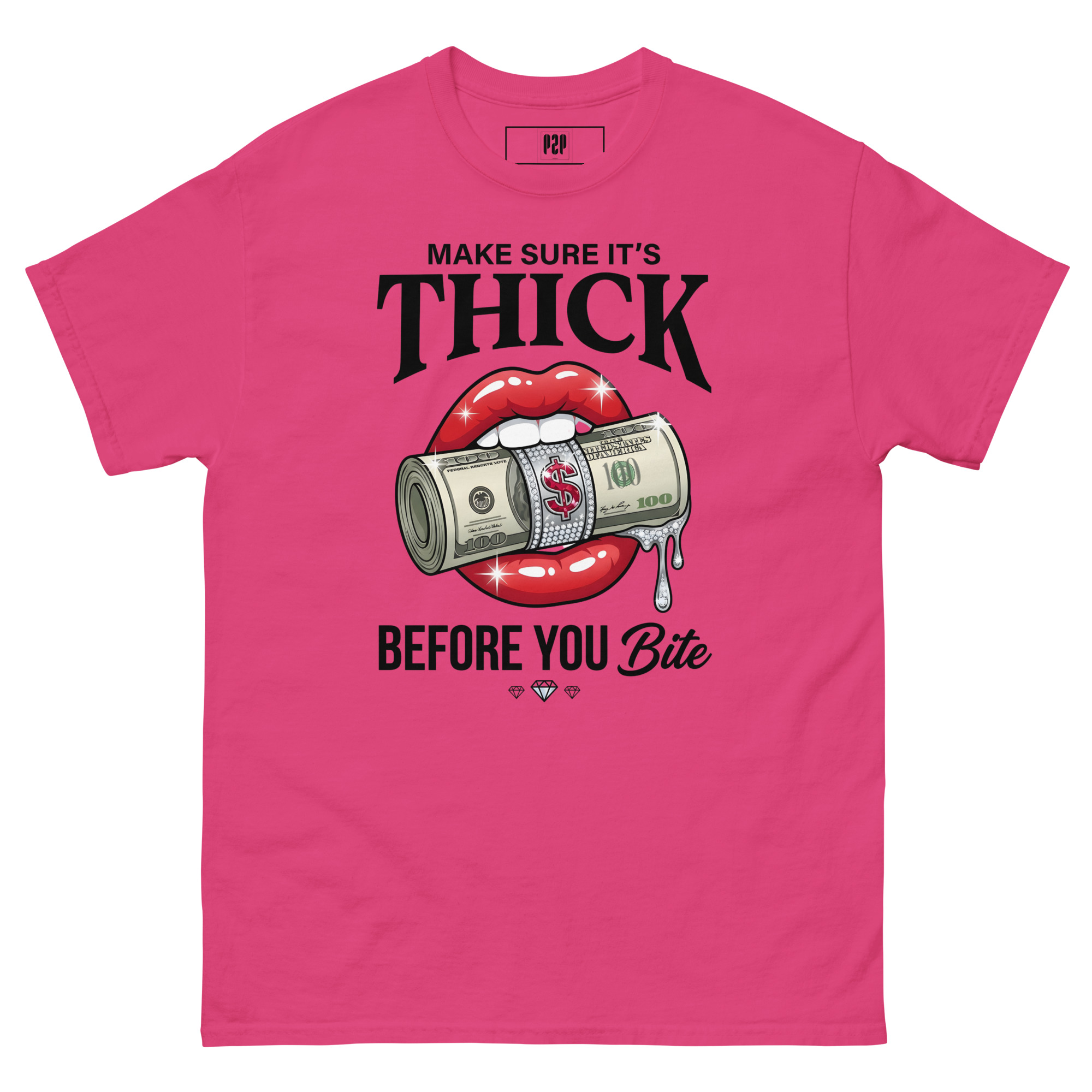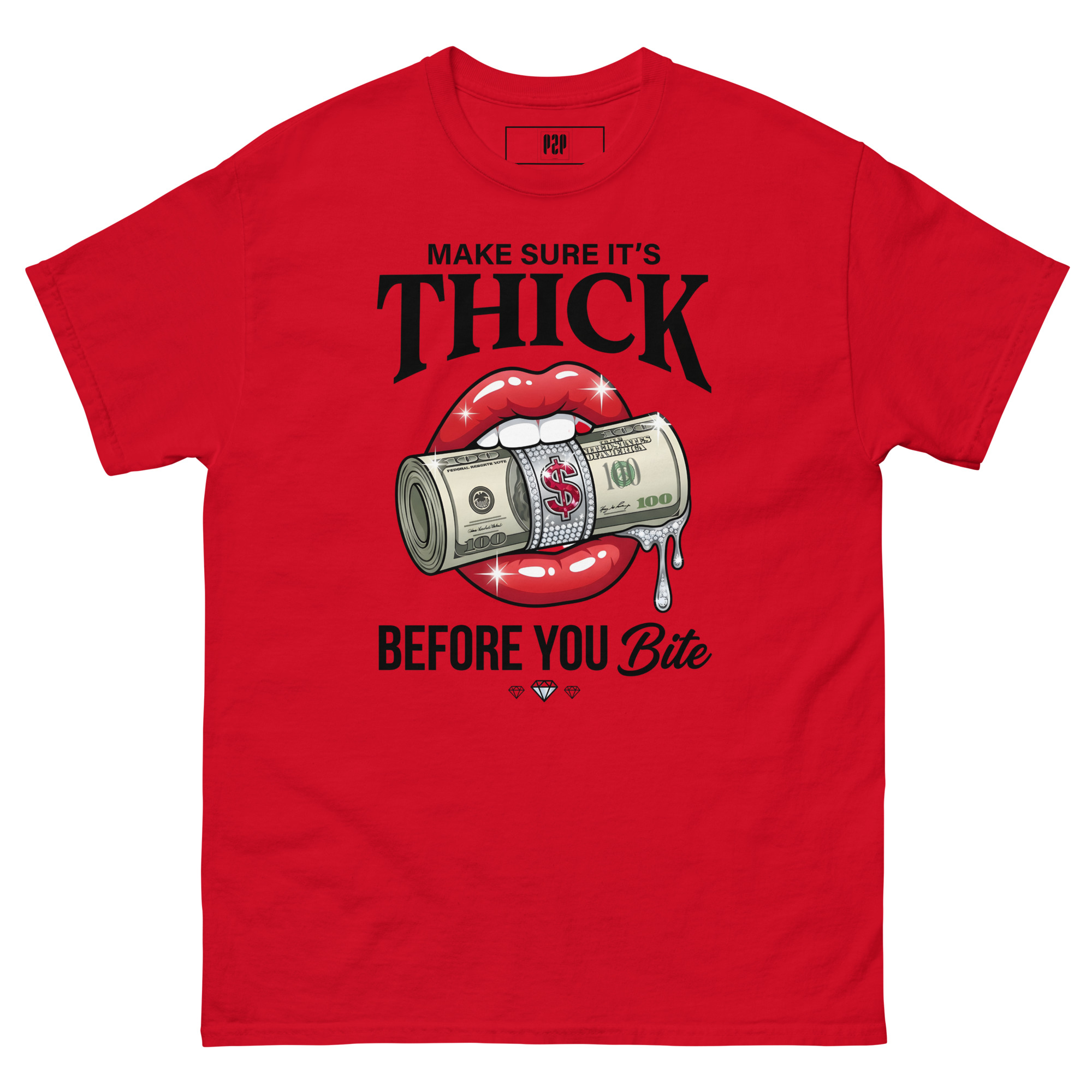 Dripping with serious Y2K nostalgia and unapologetic sass, this graphic tee is a total mood. Featuring a pair of luscious red lips biting down on a diamond-encrusted stack of hundreds, the MAKE SURE IT’S THICK BEFORE YOU BITE design serves absolute boss energy. It is the ultimate streetwear statement piece for those who like their humor spicy, their standards high, and their cash flow heavy. 💸✨