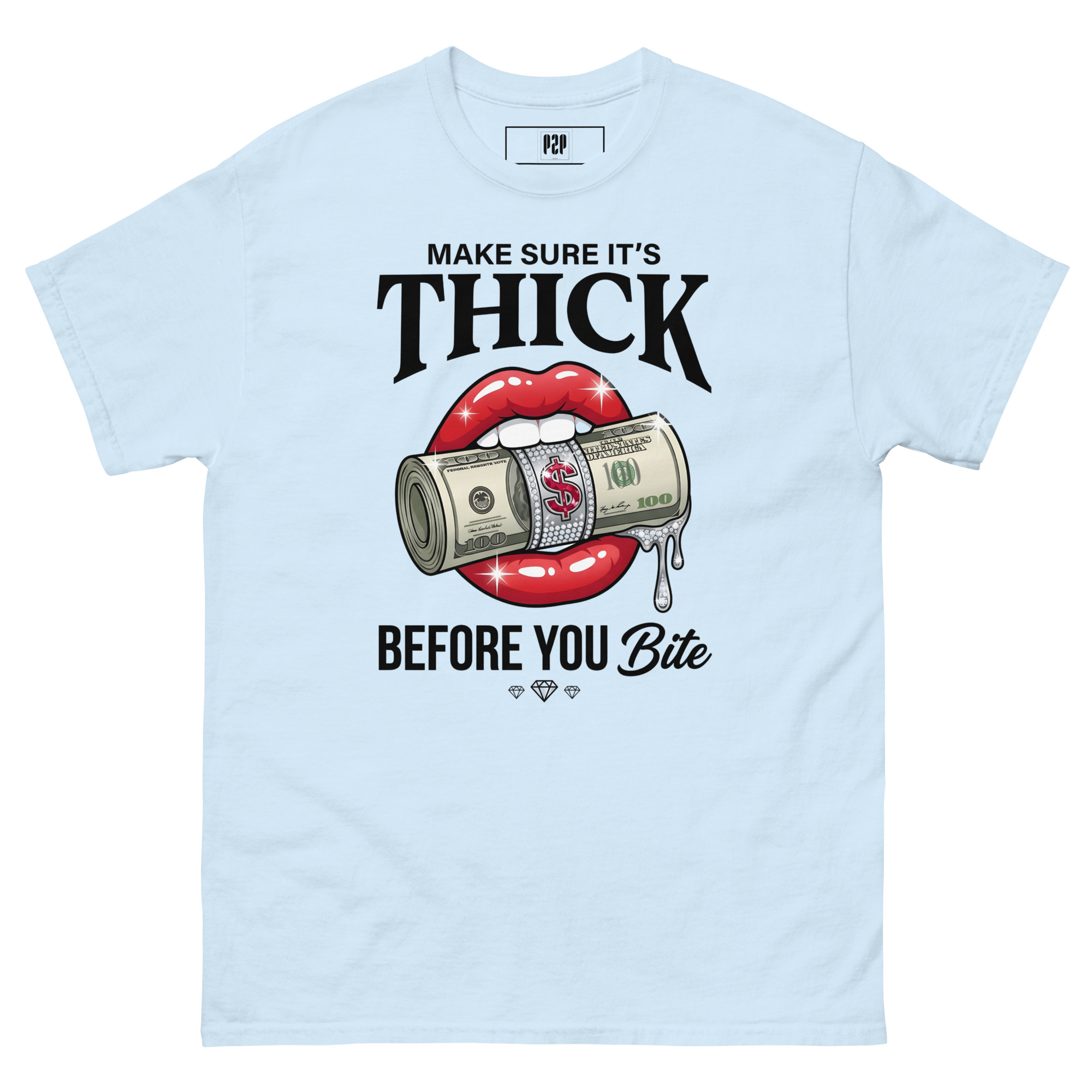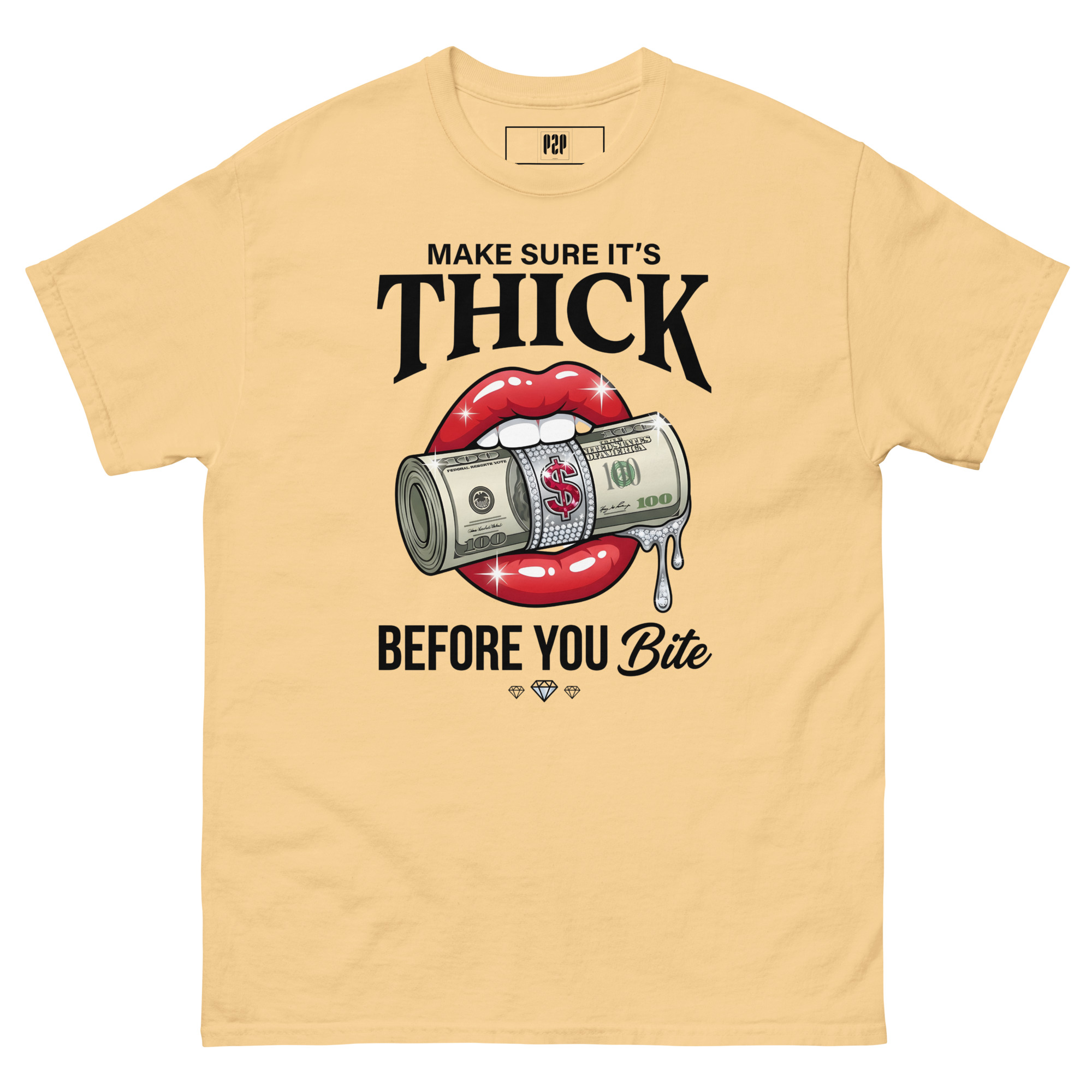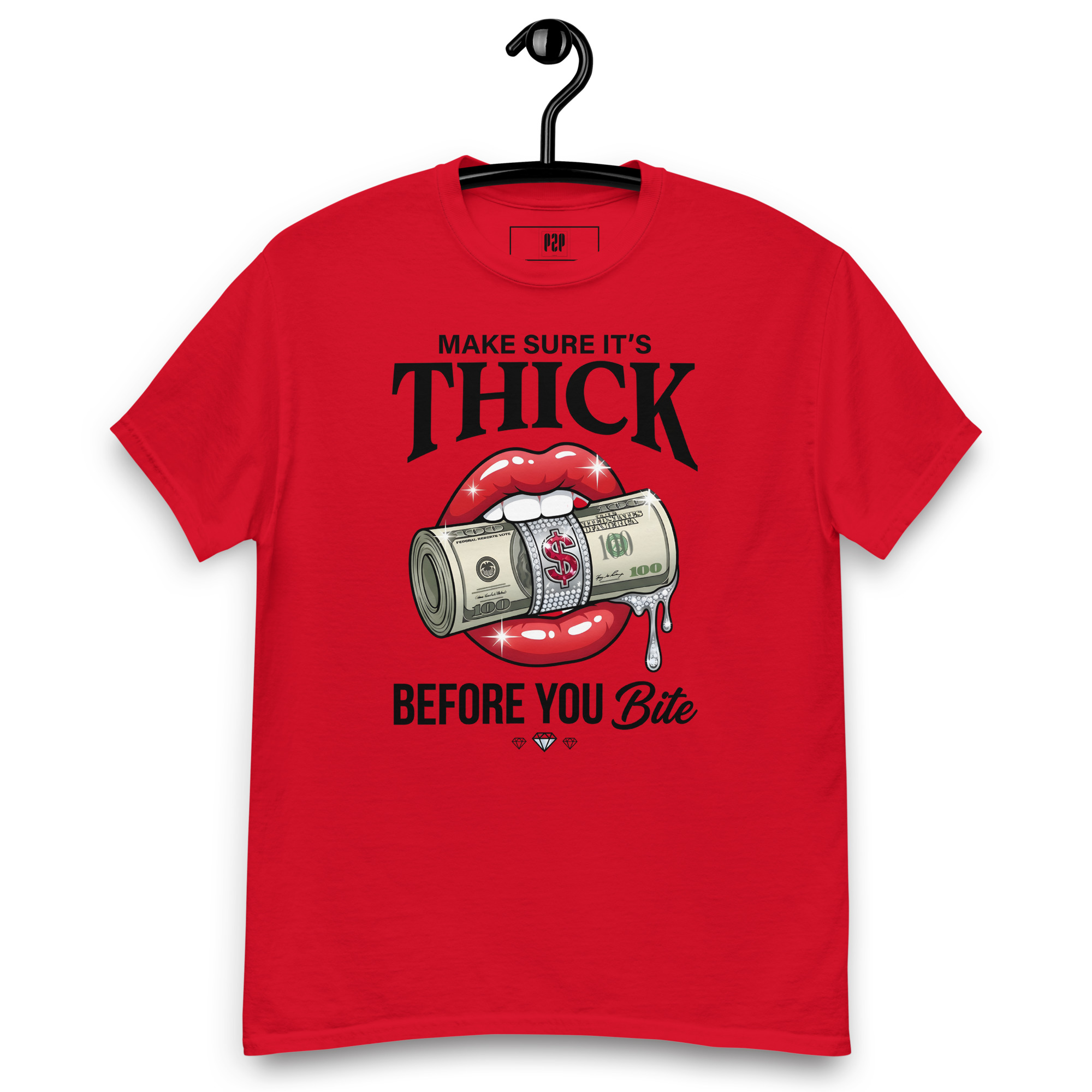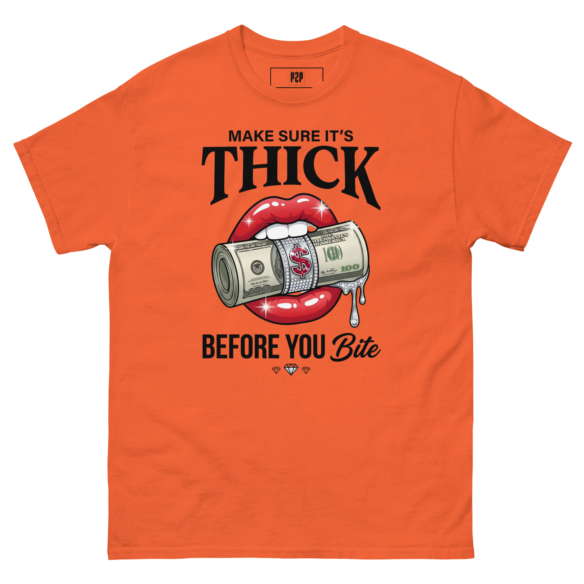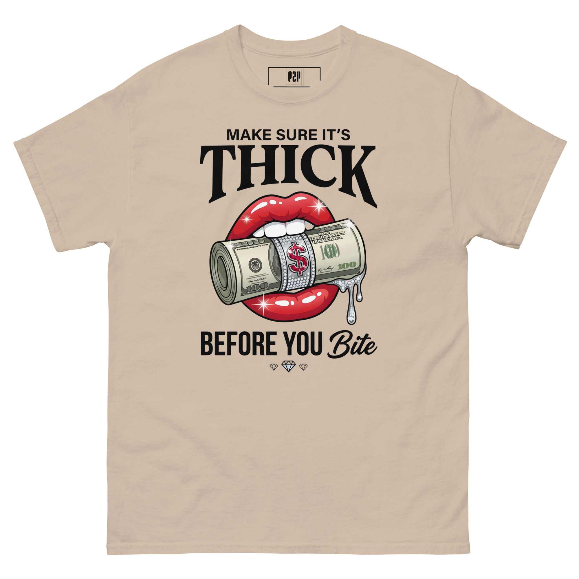 Dripping with serious Y2K nostalgia and unapologetic sass, this graphic tee is a total mood. Featuring a pair of luscious red lips biting down on a diamond-encrusted stack of hundreds, the MAKE SURE IT’S THICK BEFORE YOU BITE design serves absolute boss energy. It is the ultimate streetwear statement piece for those who like their humor spicy, their standards high, and their cash flow heavy. 💸✨