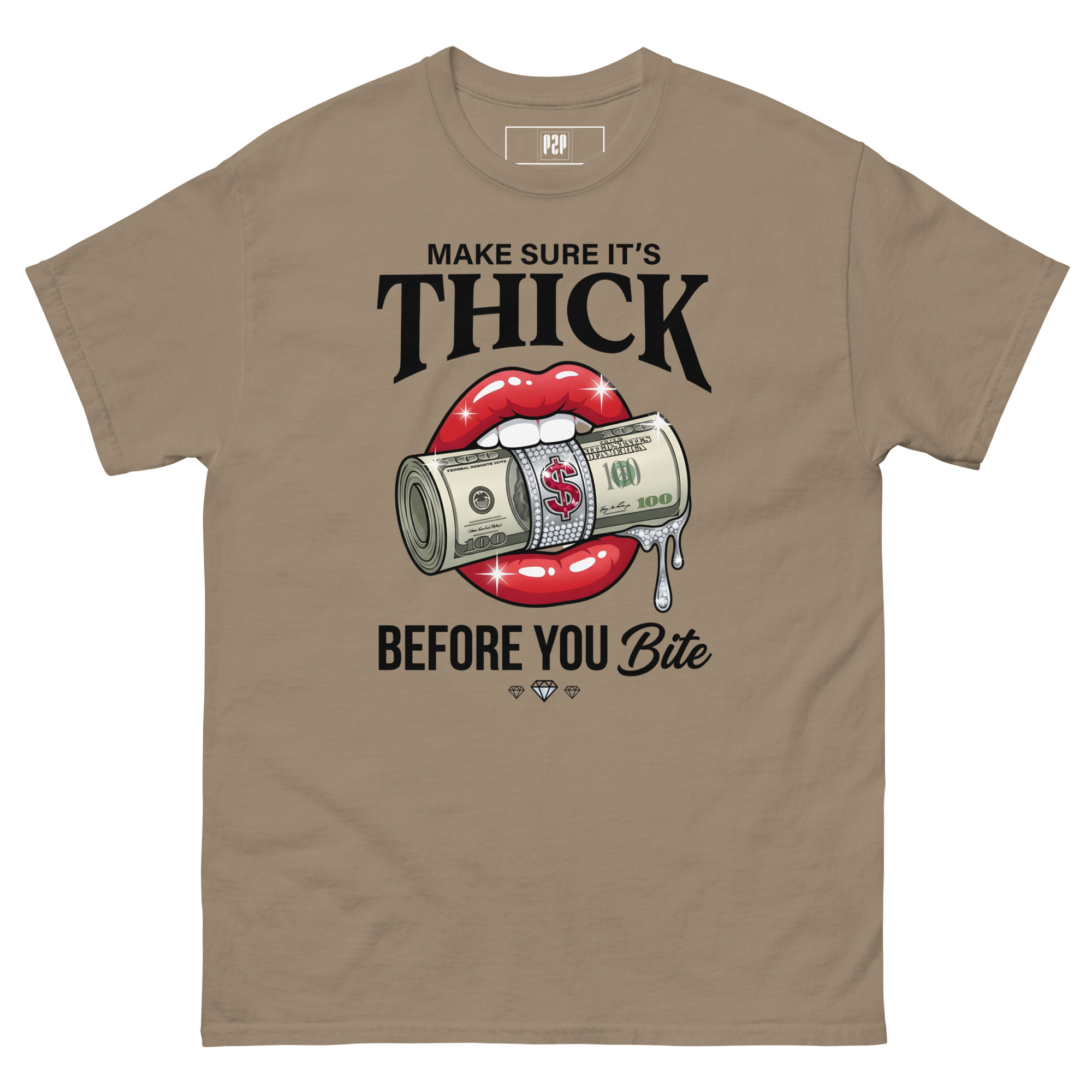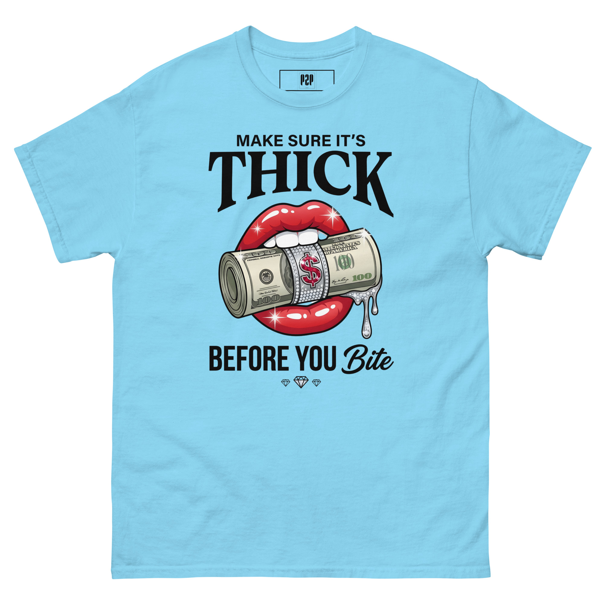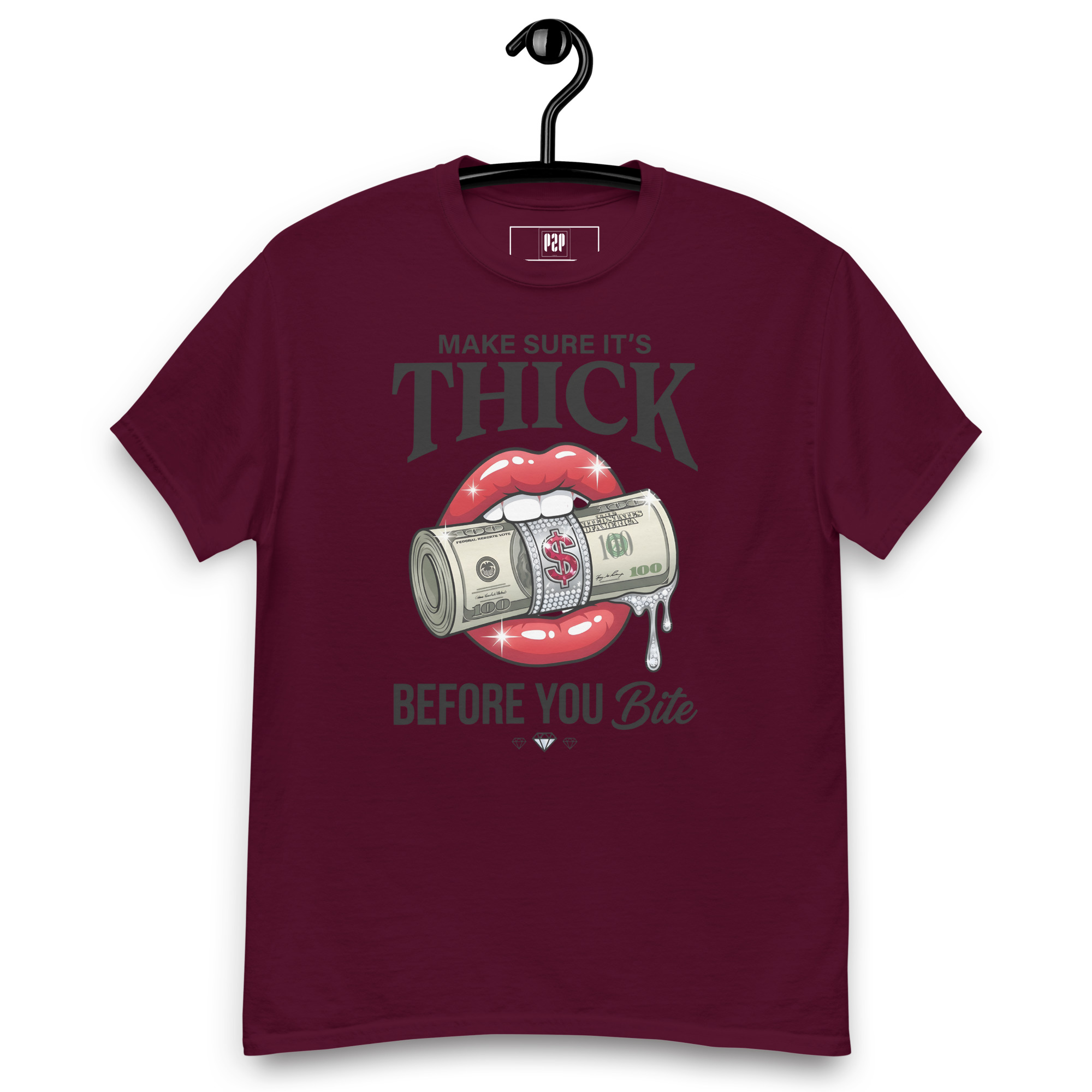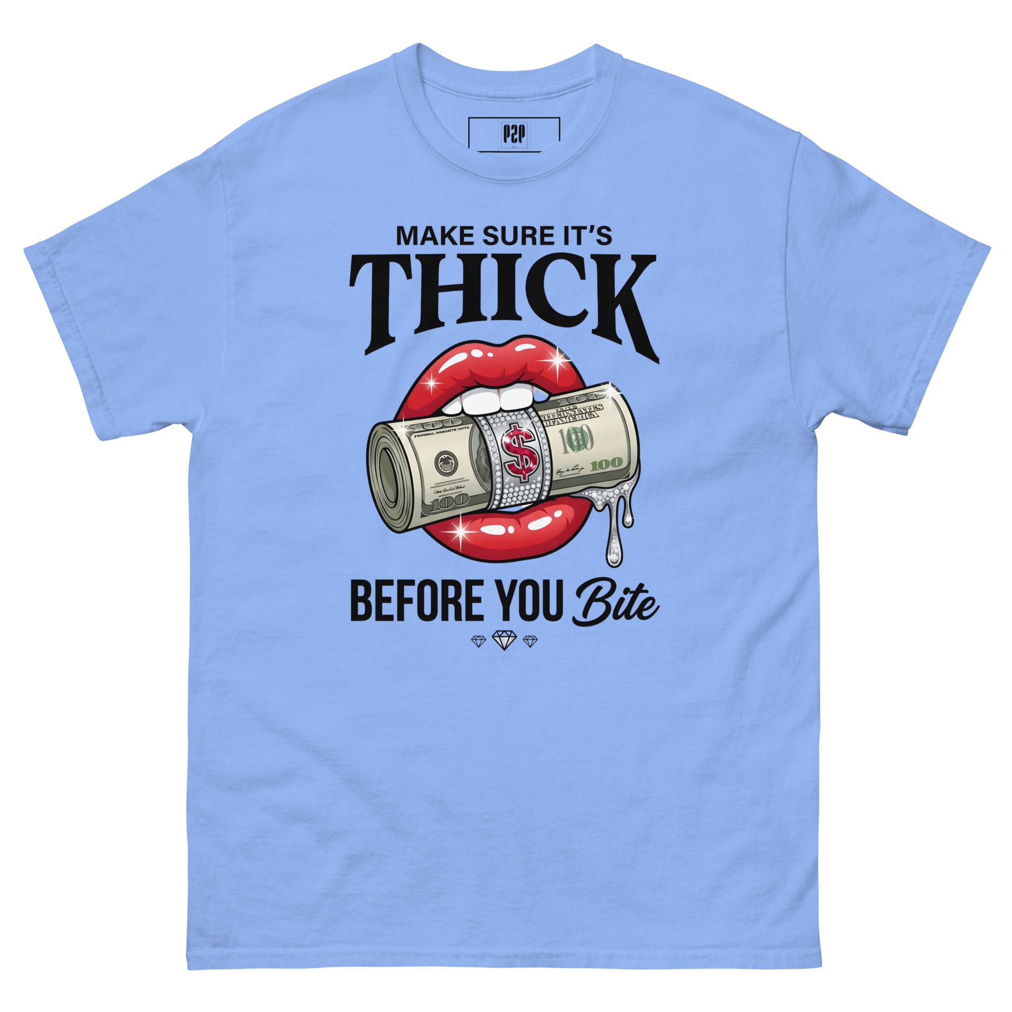 Dripping with serious Y2K nostalgia and unapologetic sass, this graphic tee is a total mood. Featuring a pair of luscious red lips biting down on a diamond-encrusted stack of hundreds, the MAKE SURE IT’S THICK BEFORE YOU BITE design serves absolute boss energy. It is the ultimate streetwear statement piece for those who like their humor spicy, their standards high, and their cash flow heavy. 💸✨