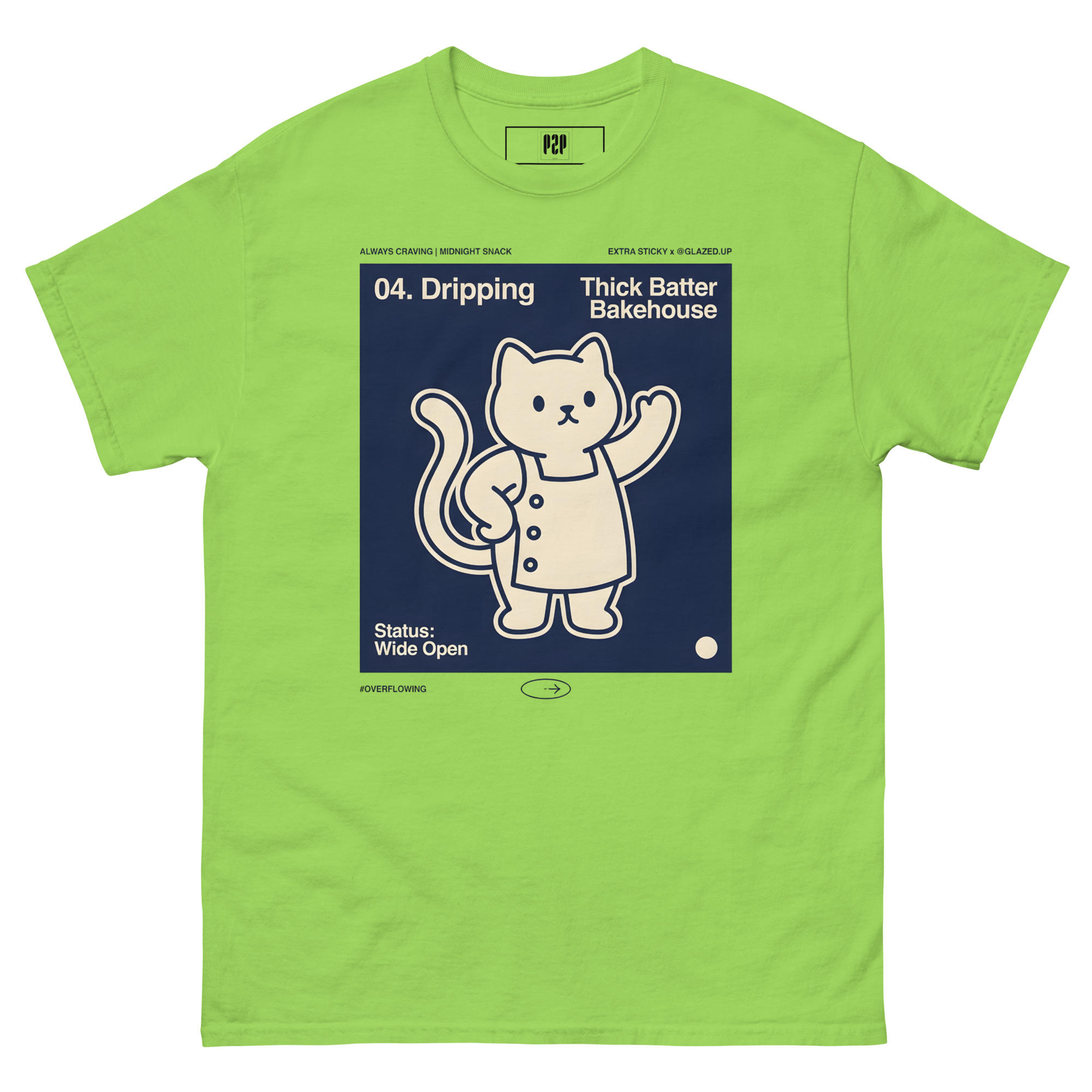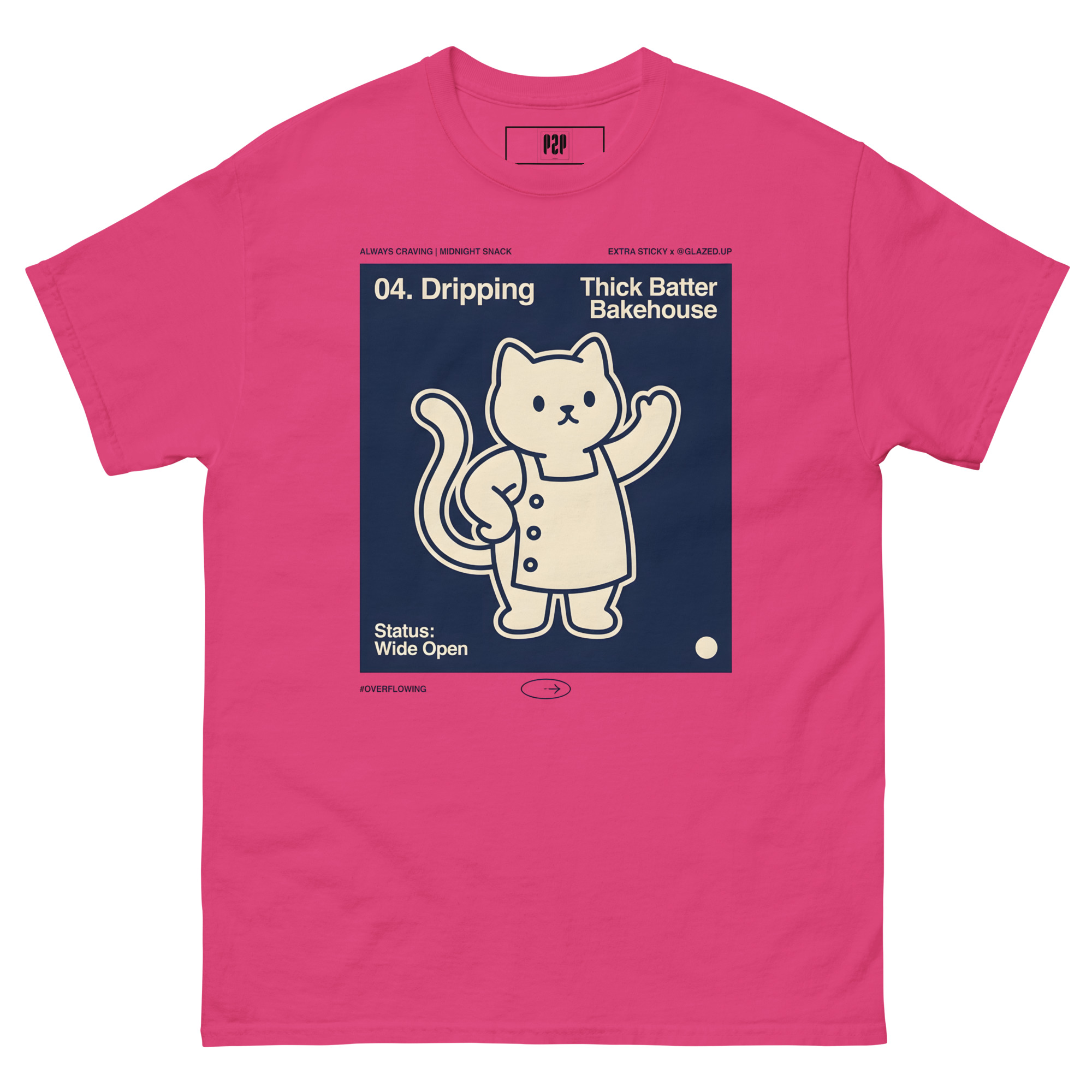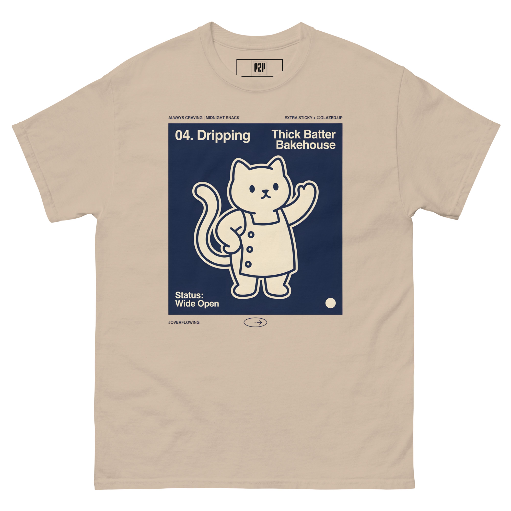 SERVING UP MAJOR Y2K NOSTALGIA WITH A REBELLIOUS, UNAPOLOGETIC TWIST, THIS GRAPHIC PULLS NO PUNCHES. FEATURING A CHEEKY FELINE BAKER AND MORE INNUENDOS THAN YOUR FAVORITE EARLY 2000S POP SONG, IT IS THE ULTIMATE CONVERSATION STARTER. PERFECT FOR THOSE LATE NIGHTS WHEN EVERYTHING IS DRIPPING AND YOU ARE FEELING GLAZED UP AND OVERFLOWING WITH MAIN CHARACTER ENERGY.