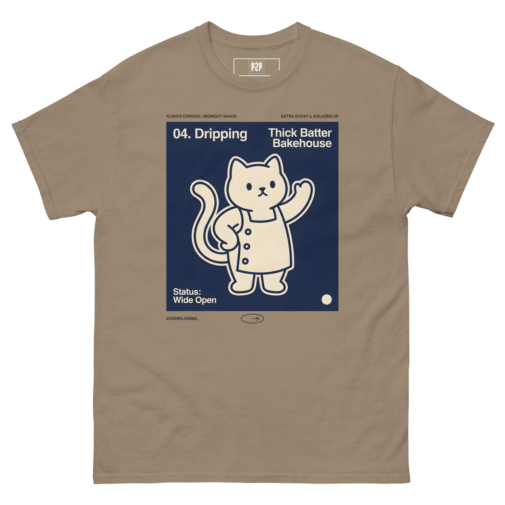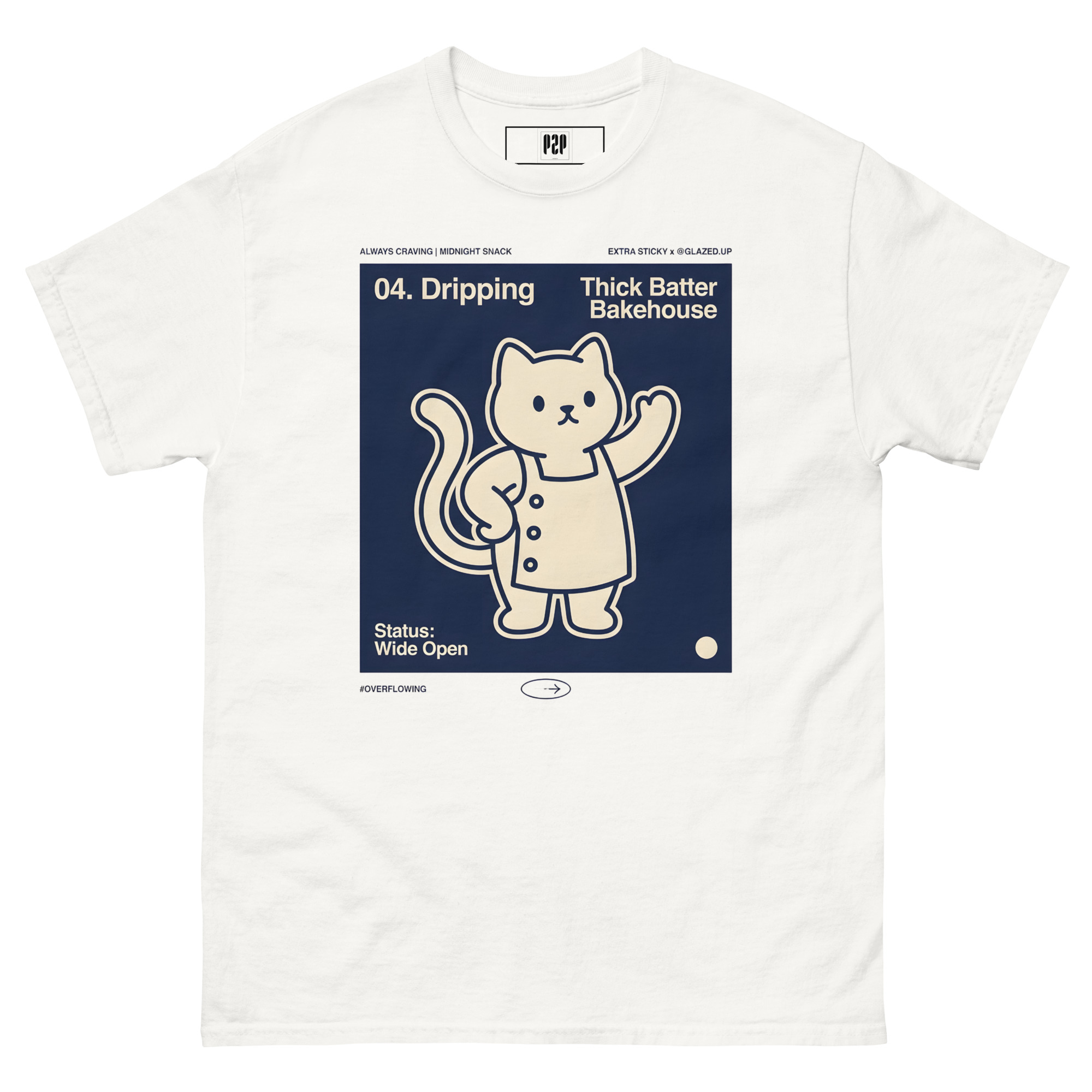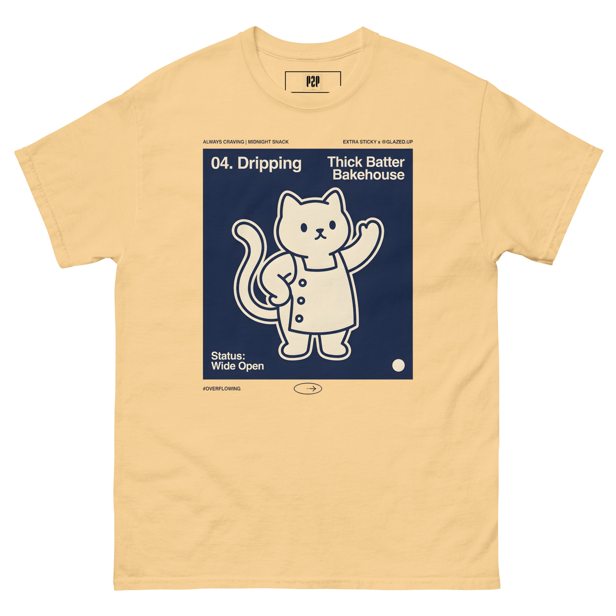 SERVING UP MAJOR Y2K NOSTALGIA WITH A REBELLIOUS, UNAPOLOGETIC TWIST, THIS GRAPHIC PULLS NO PUNCHES. FEATURING A CHEEKY FELINE BAKER AND MORE INNUENDOS THAN YOUR FAVORITE EARLY 2000S POP SONG, IT IS THE ULTIMATE CONVERSATION STARTER. PERFECT FOR THOSE LATE NIGHTS WHEN EVERYTHING IS DRIPPING AND YOU ARE FEELING GLAZED UP AND OVERFLOWING WITH MAIN CHARACTER ENERGY.