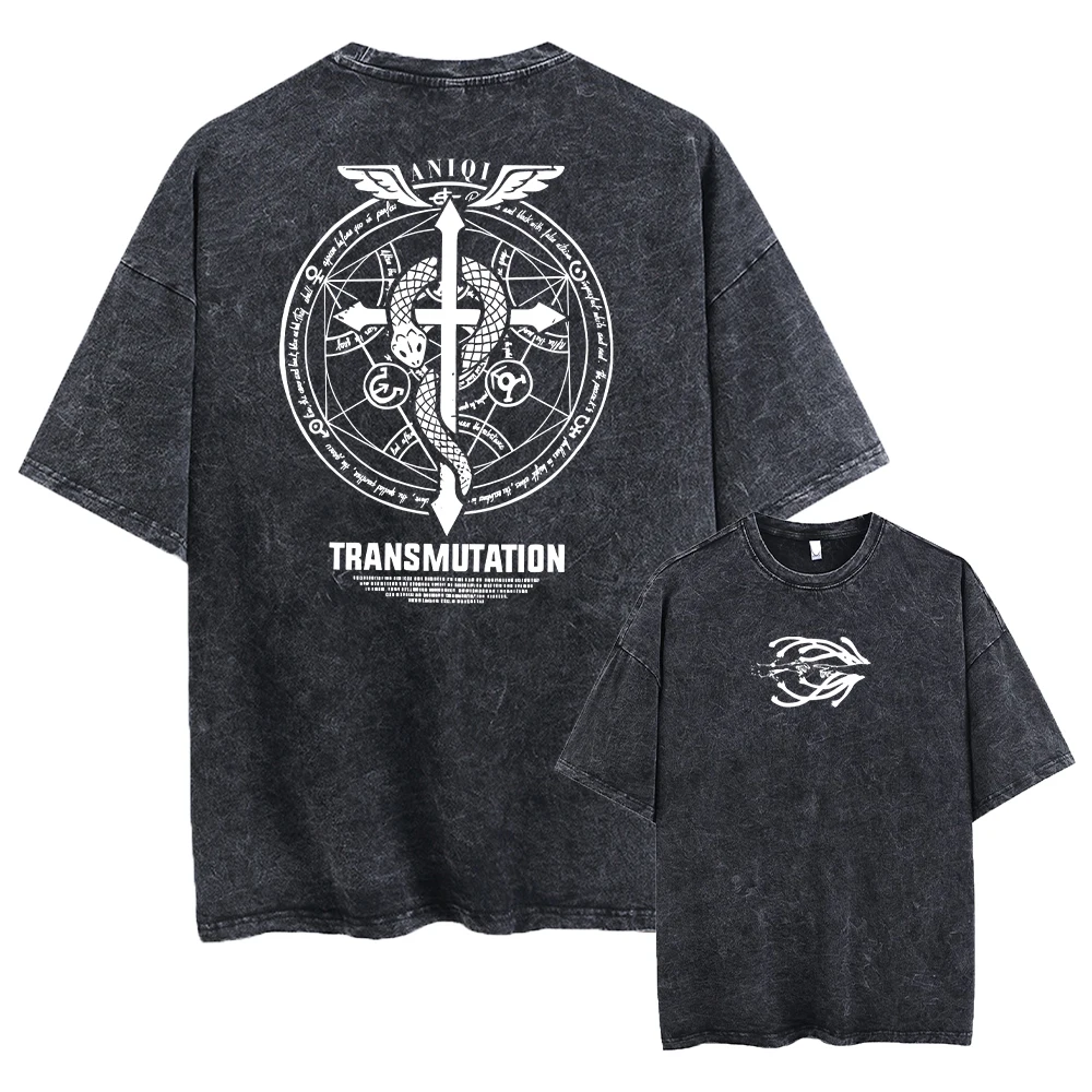 The law of equivalent exchange. This edgy tee features a detailed Alchemy Transmutation Circle back graphic. Heavy cotton, dope acid-wash look, and major anime aesthetic vibes. Perfect for fans of dark fantasy manga. Cop the ultimate power drip!